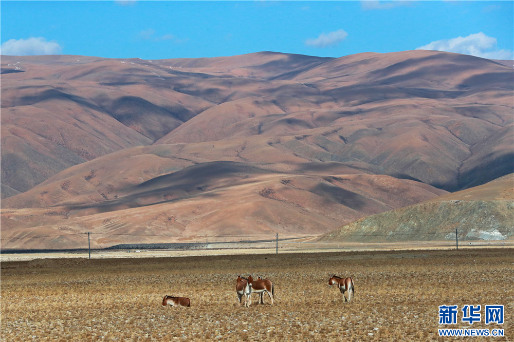 拉昂错前的几匹藏野驴。新华网 王智超摄