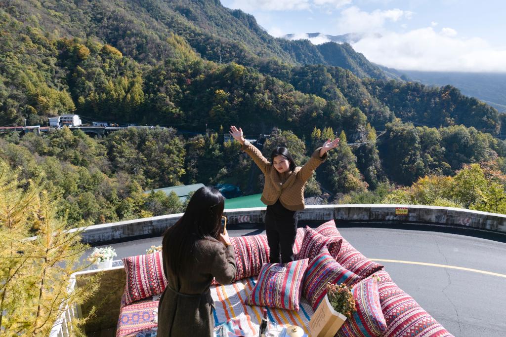 10月30日,游人在镇坪县化龙山一处咖啡馆的露台上拍照(无人机照片)。