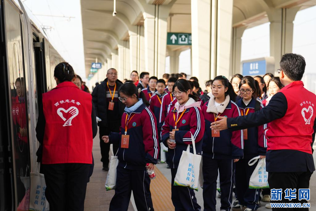 12月7日,学生代表在铜川站登乘复兴号动车组列车。