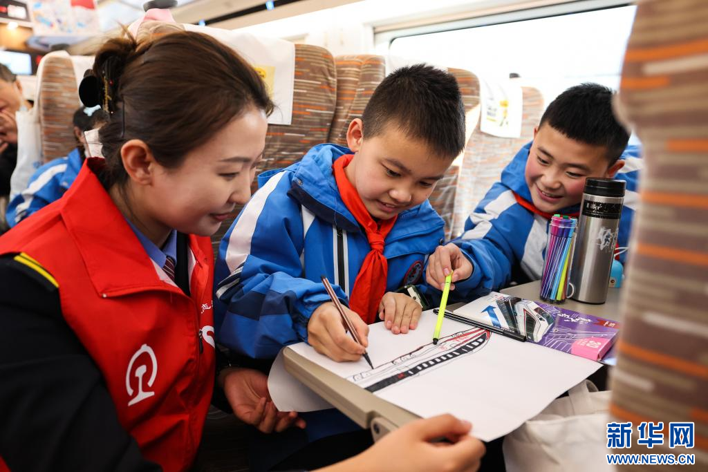 12月7日,学生代表在开往西安北站的复兴号动车组列车上进行铁路主题创意绘画。