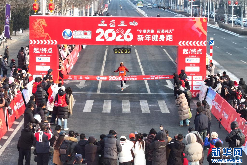 2026年1月1日,在宁夏银川市兴庆区,跑步爱好者参加新年健身跑活动(无人机照片)。