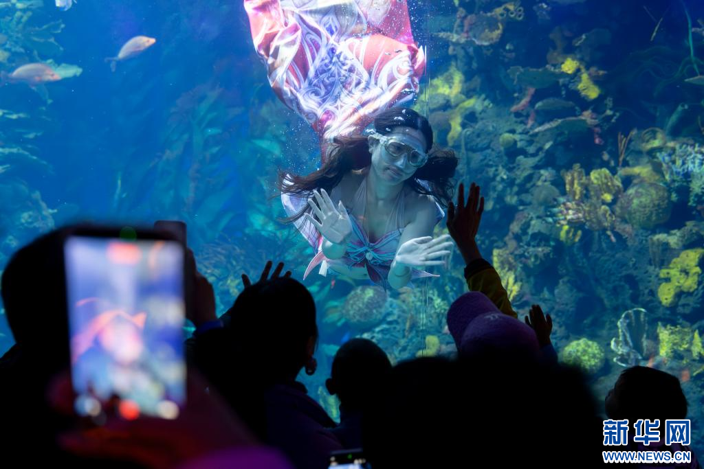 2026年1月1日,在上海长风海洋世界,美人鱼表演者与游客互动。