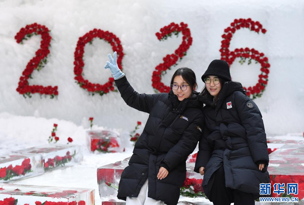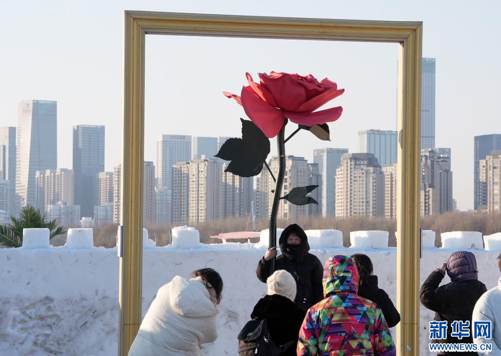 2026年1月1日,在沈阳浑河外滩市集,市民在玫瑰相框景观造型处拍照留影。
