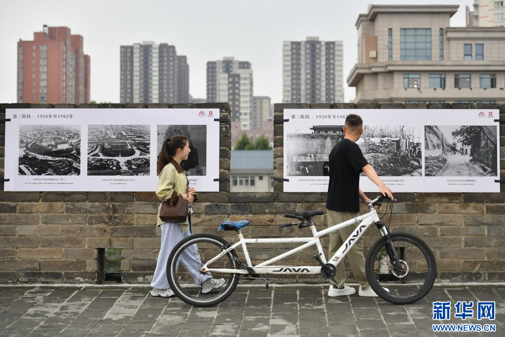 游客在西安城墙上参观以城墙保护为主题的图片展(2025年9月10日摄)。