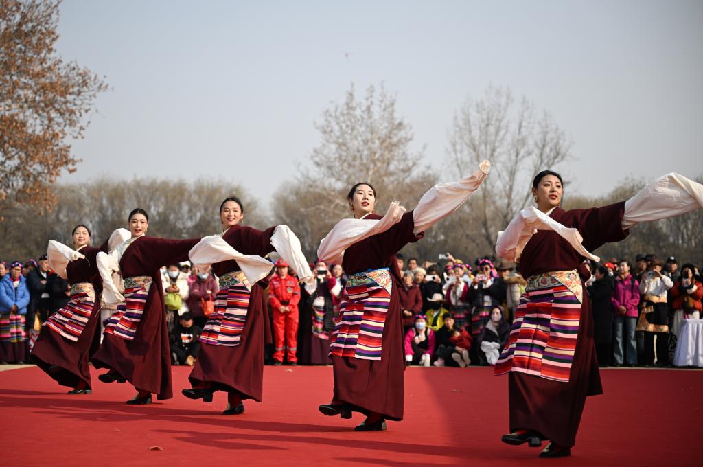 1月17日,来自西藏自治区昌都市基层文艺团体的演员在西安大明宫国家遗址公园表演舞蹈。