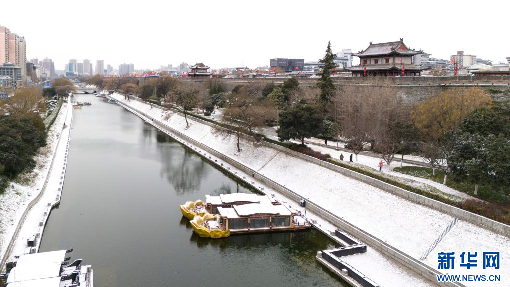 西安城墙东南角下的护城河(无人机照片,1月20日摄)。