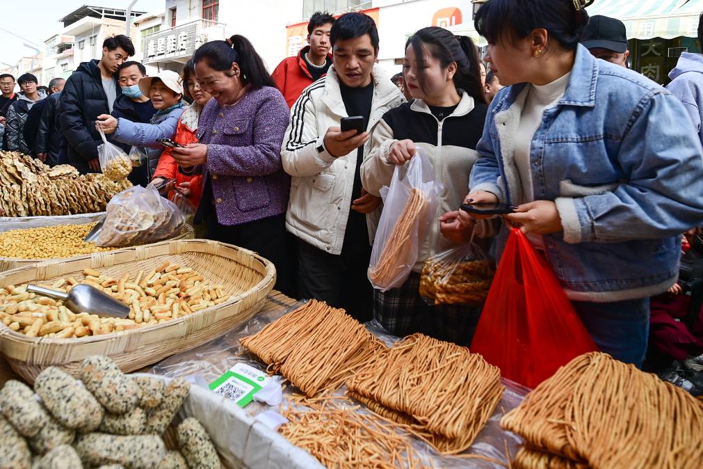 2月13日,游客在焦岱大集上选购特色食品。