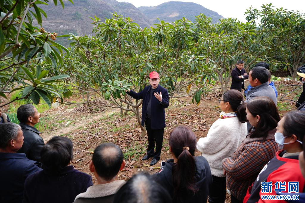 3月2日,在陕西省旬阳市城关镇两岔河村的枇杷林中,旬阳市林业技术推广站站长向甲斌向村民讲解果树管理的细节。新华社记者 邵瑞 摄