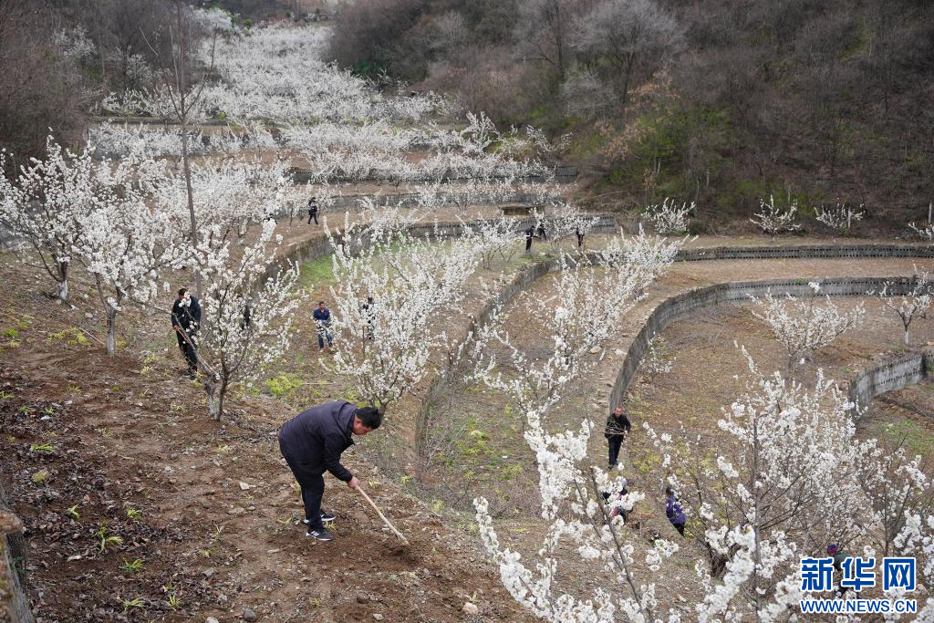 3月3日,在旬阳市段家河镇薛家湾社区樱桃园内,镇村干部和村民一起开展园区春管工作。新华社记者 邵瑞 摄pagebreak