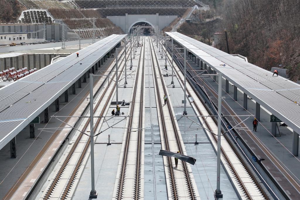 3月20日,工人在柞水西站高铁轨道上施工作业(无人机照片)。
