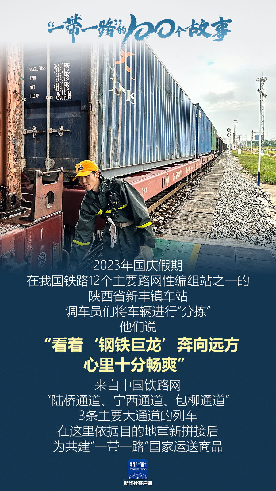 2023年国庆假期,在我国铁路12个主要路网性编组站之一的陕西省新丰镇车站,调车员们将车辆进行‘分拣’。他们说:“看着‘钢铁巨龙’奔向远方,心里十分畅爽。”来自中国铁路网“陆桥通道、宁西通道、包柳通道”3条主要大通道的列车,在这里依据目的地重新拼接后,为共建“一带一路”国家运送商品。(记者:郑昕)