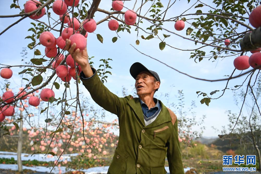10月19日,南沟村果农胡福义在自家果园查看苹果长势。新华社记者 邹竞一 摄