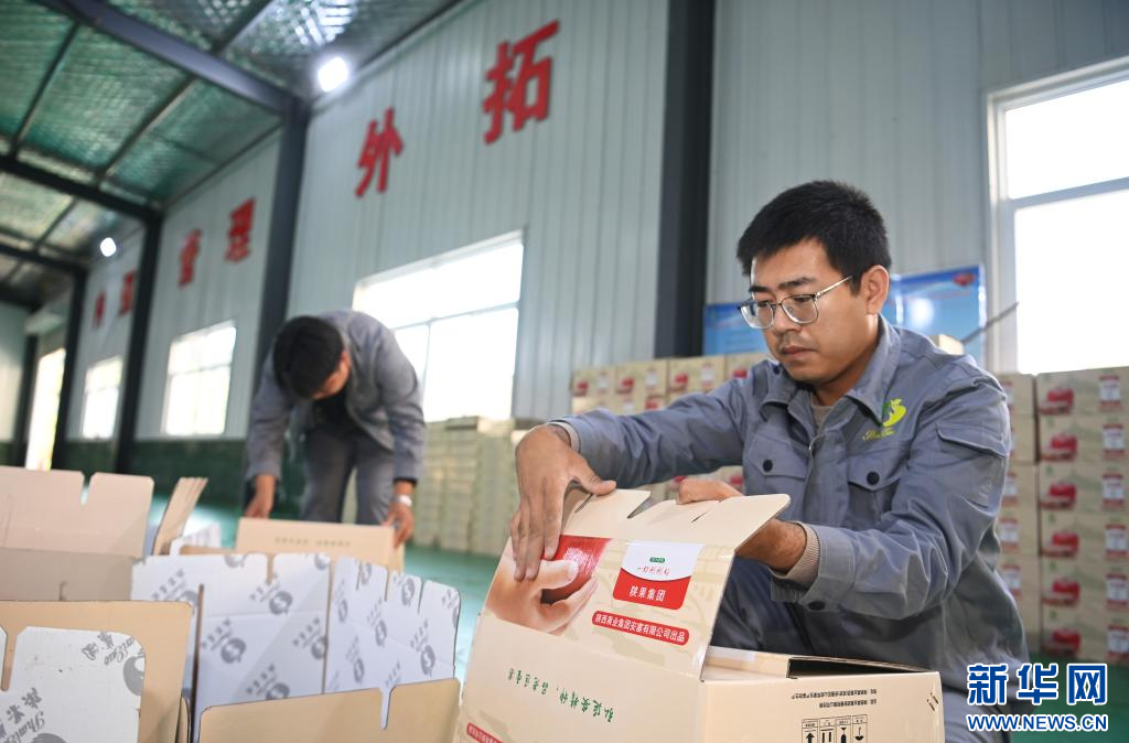 10月19日,一家果业公司的工作人员在南沟村整理纸箱,为苹果采收做准备。新华社记者 邹竞一 摄