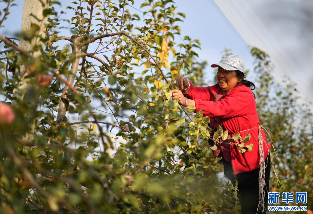 10月19日,果农在南沟村山地苹果园管护果树。新华社记者 邹竞一 摄