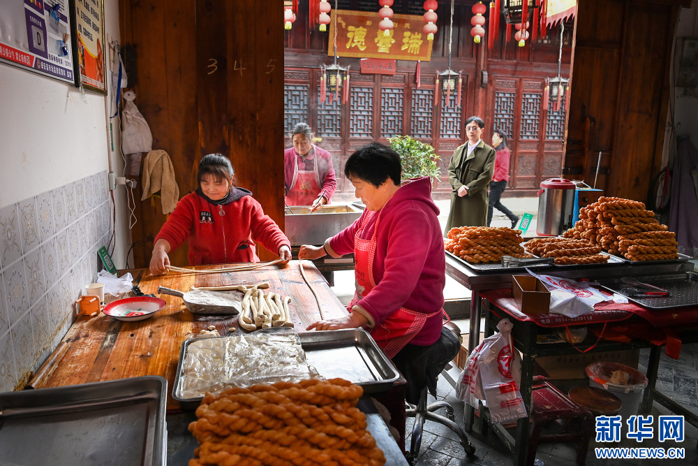 11月24日,云盖寺镇老街前街的“ 张记酥麻花”员工在制作酥麻花。老街上有丰富多味的各种地方小吃。新华网发(郑煊 摄)