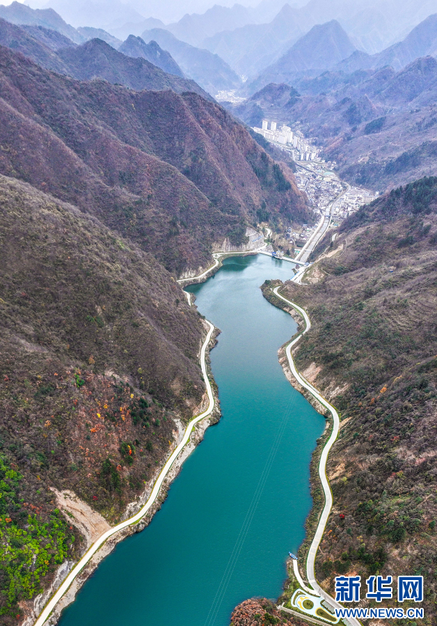 11月24日航拍的云镇水库。云镇水库与云盖古镇相连,也是国家AAAA级云盖寺古镇景区的重要组成部分。新华网发(郑煊 摄)