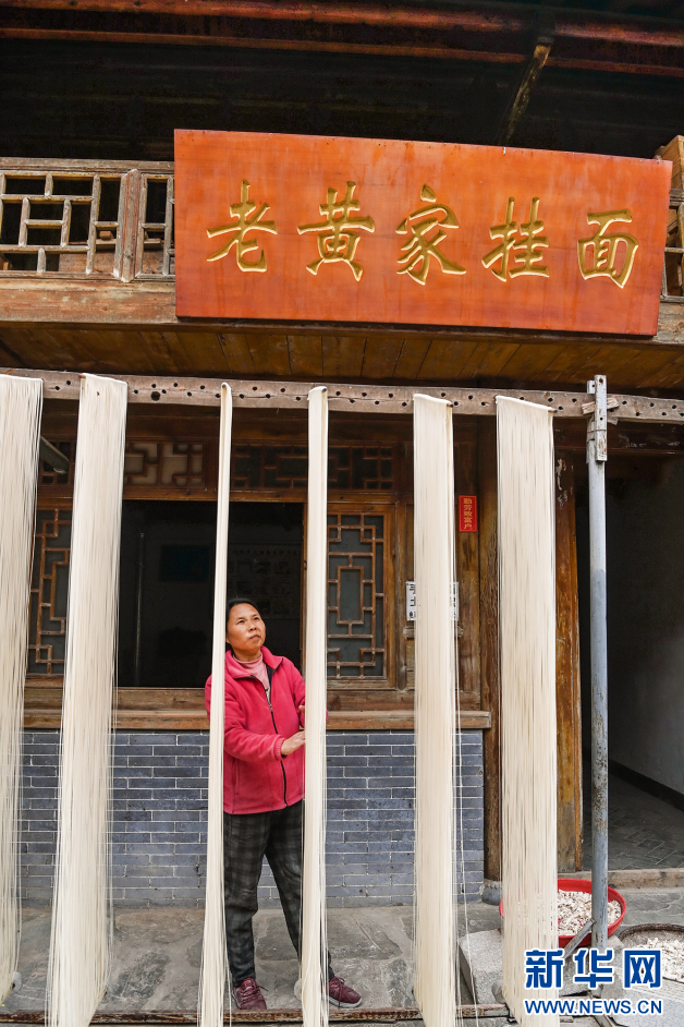11月24日,云盖寺镇老街前街的“老黄家挂面”主人在制作挂面。新华网发(郑煊 摄)