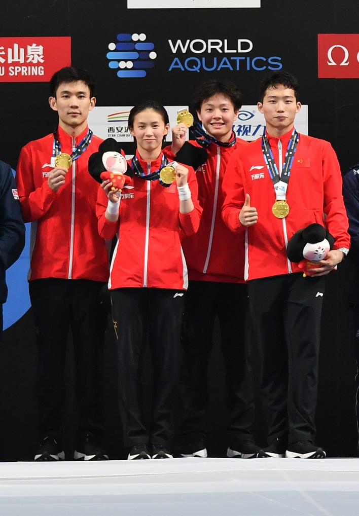 当日,在陕西西安举行的2024年跳水世界杯总决赛混合团体决赛中,由杨昊、陈芋汐、陈艺文、王宗源组成的中国队以500.75分的总成绩夺得冠军。新华社记者 张博文 摄pagebreak