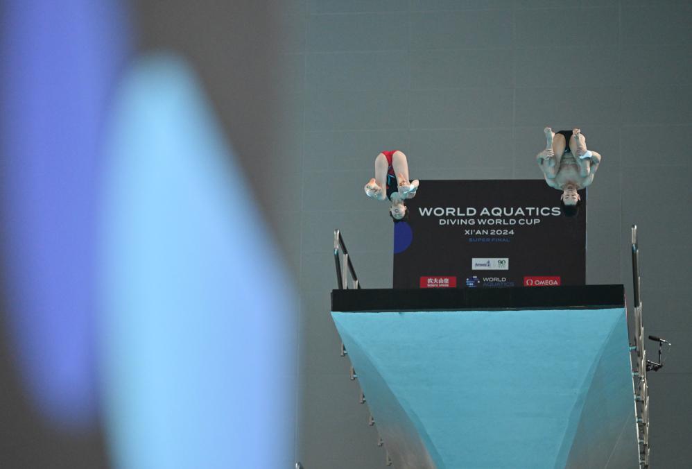 当日,在陕西西安举行的2024年跳水世界杯总决赛混合团体决赛中,由杨昊、陈芋汐、陈艺文、王宗源组成的中国队以500.75分的总成绩夺得冠军。新华社记者 李一博 摄pagebreak