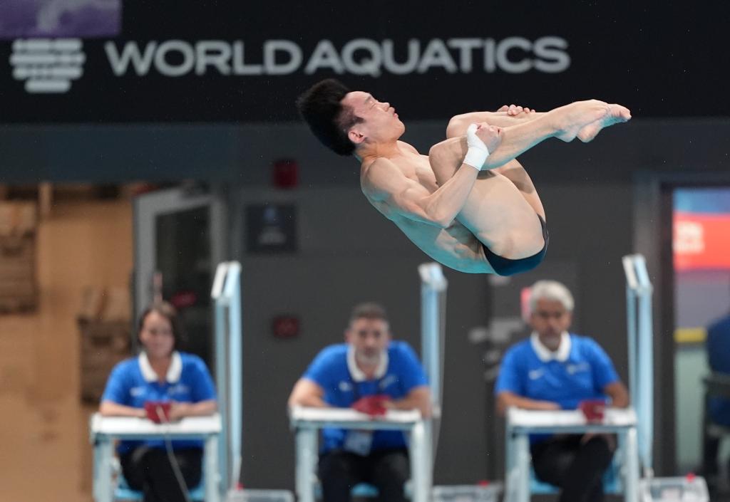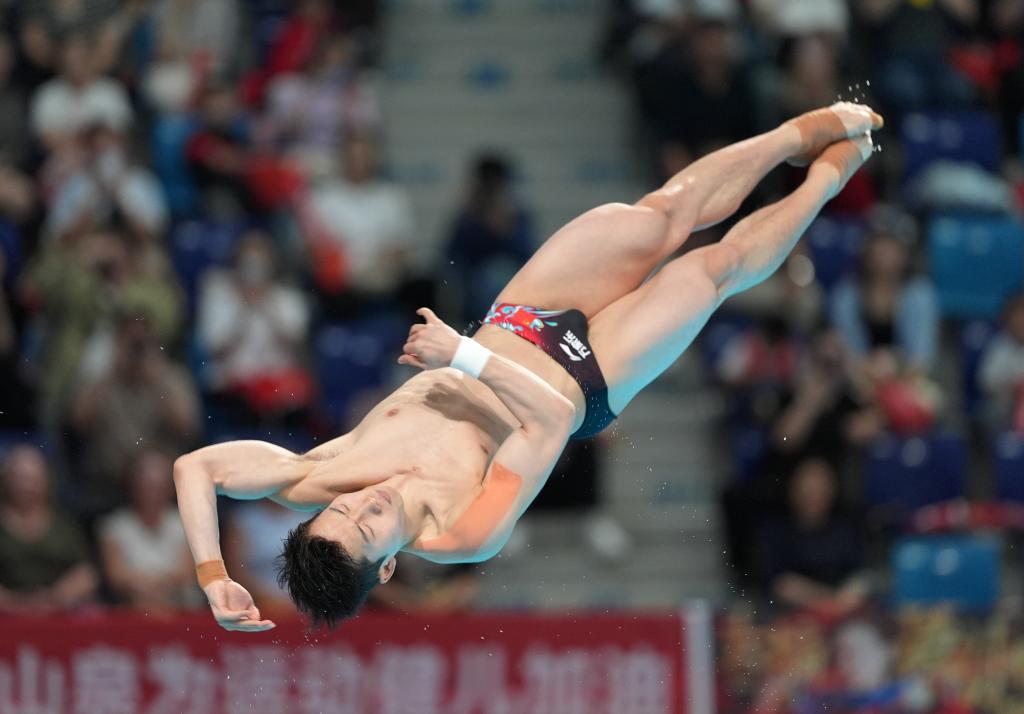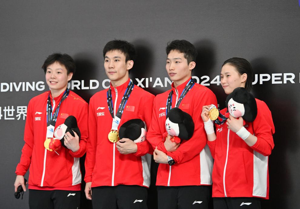 当日,在陕西西安举行的2024年跳水世界杯总决赛混合团体决赛中,由杨昊、陈芋汐、陈艺文、王宗源组成的中国队以500.75分的总成绩夺得冠军。新华社记者 李一博 摄