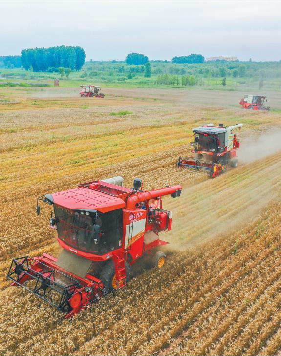 6月6日,在西安沣河畔的麦田里,西安正社小麦玉米专业合作社动用多台大型收割机抢收小麦。 记者 袁景智摄