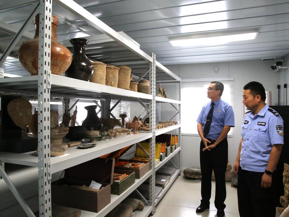渭城区人民检察院检察官与侦查人员查看涉案文物存放情况。(陕西省人民检察院供图)
