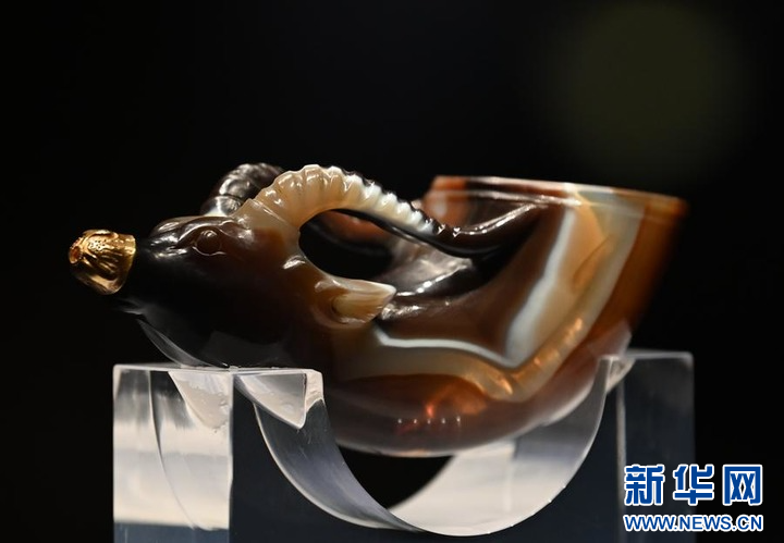 图为陕西历史博物馆拍摄的馆藏唐代文物珍品——镶金兽首玛瑙杯(资料图片)。新华社记者 李一博 摄