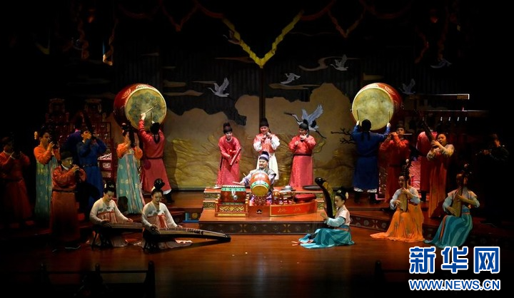 活动当天,西安大唐芙蓉园紫云楼上,鼓声阵阵,丝竹声声。一场融合西安鼓乐、仿唐乐舞的大型唐代宫廷燕乐《鼓》,仿佛打开时光通道,让人瞬时穿越回气势磅礴的大唐时代。