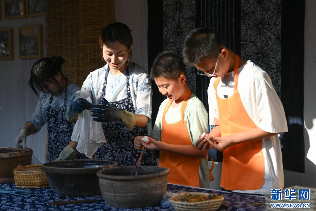 6月22日,学生在新庄村的“木兰摇”非遗工坊体验扎染技艺。新华社记者 邹竞一 摄