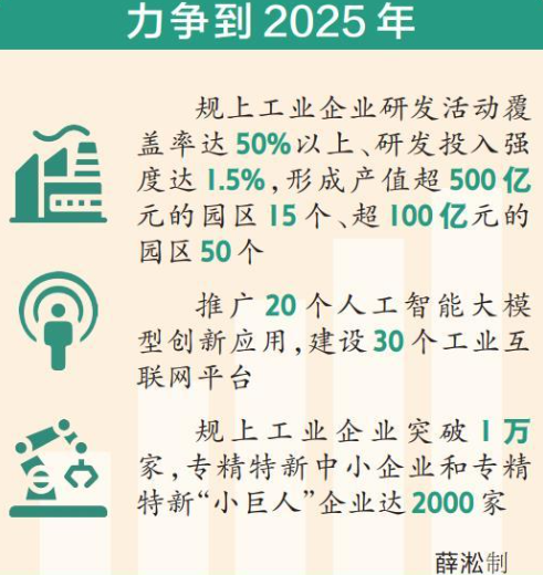 《实施方案》提出“七个强化”,制定20项具体举措,推动重点任务落地见效。强化链主企业领航作用,发挥链主企业集聚带动作用,推动链主企业与配套企业协同发展;强化“链长制”工作机制,夯实工作专班责任;强化产业平台创新赋能,力争到2025年,规上工业企业研发活动覆盖率达50%以上、研发投入强度达1.5%,形成产值超500亿元的园区15个、超100亿元的园区50个;强化数智赋能绿色转型,力争到2025年,推广20个人工智能大模型创新应用,建设30个工业互联网平台;强化经营主体培育,力争到2025年,规上工业企业突破1万家,专精特新中小企业和专精特新“小巨人”企业达2000家;强化政策支撑和资源要素供给,发挥财税金融政策效能,提升资源保障水平,建设高素质人才队伍;强化工作保障,健全工作协调推进机制,建立完善统计监测制度,完善安全风险防范体系,建立综合评价机制。(记者 苏怡)