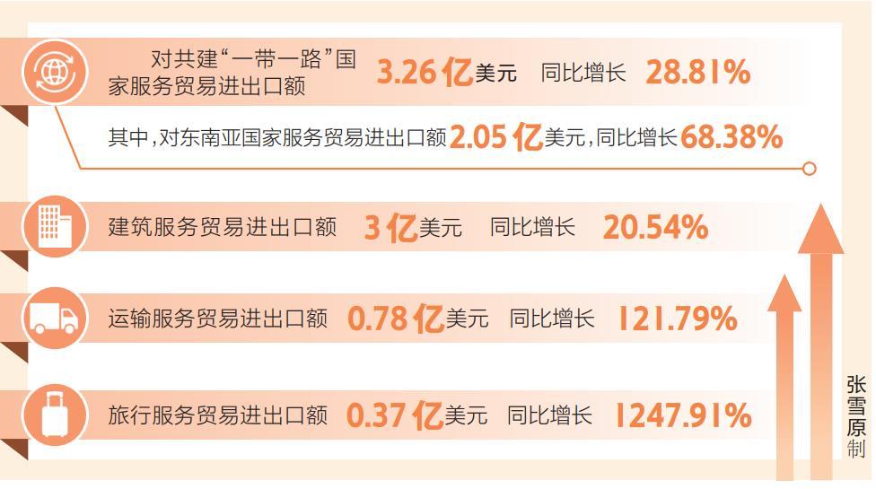 对共建“一带一路”国家的服务贸易业务增长迅速。上半年重点监测企业对共建“一带一路”国家服务贸易进出口额3.26亿美元,同比增长28.81%。其中,对东南亚国家服务贸易进出口额2.05亿美元,同比增长68.38%。西安支持企业开拓共建“一带一路”重点国别市场,推进服务贸易高质量发展取得显著成效。