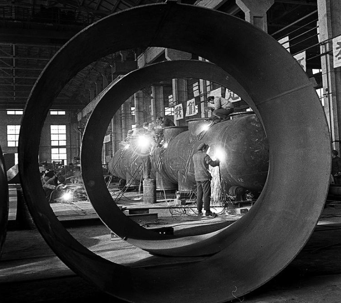 1976年西安一工厂车间,工人正在焊接作业。(刘一 摄 资料图片)
