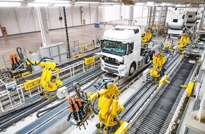 陕汽重卡扩能项目总装生产线,工业机器人正在进行汽车轮胎自动化装配作业。 (资料图片)