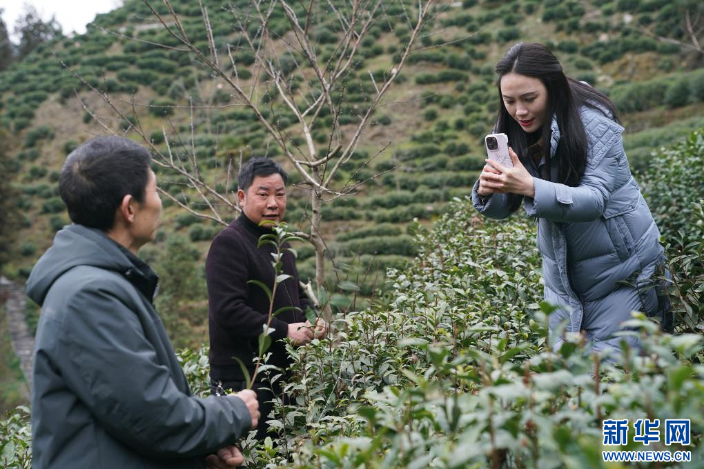 林红梅(右一)在安康市紫阳县城关镇一处茶山上拍摄记录茶园春管情况。新华社记者 邵瑞 摄