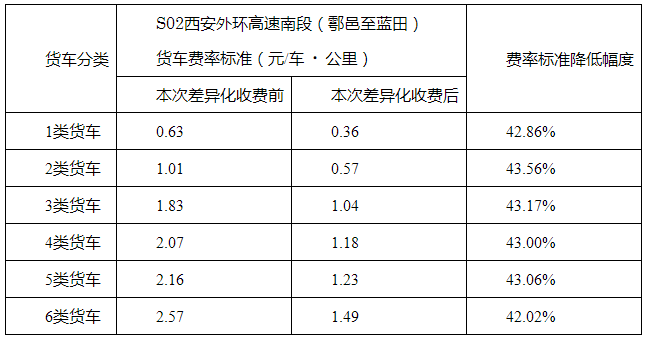 为提升西安城区大气环境质量,缓解西安绕城高速公路交通压力,进一步提高高速公路路网通行效率和服务水平,2024年11月25日0时起至2025年11月24日24时,S02西安外环高速公路南段(鄠邑至蓝田)继续实施货车差异化收费。