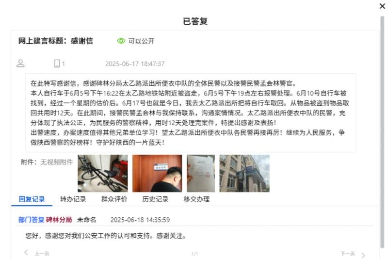 6月5日,王先生在警民网上“心连心”平台留言道:“自己的自行车停放在太乙路地铁站附近被盗走,请求民警帮助。民警得知情况后立即开展调查,从自行车被盗到失而复得仅用12天,为太乙路派出所民警的出警速度、办案速度表扬点赞!”