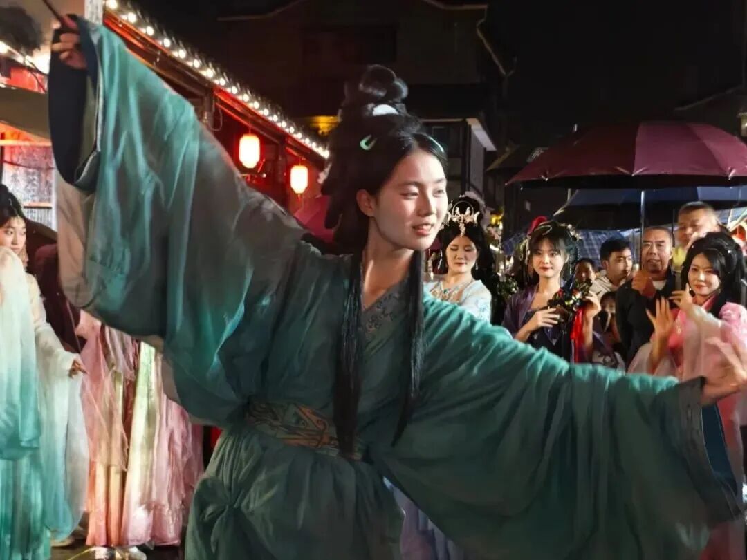 安康市石泉县古城禹王宫广场,儿童拉丁舞、街舞表演吸引了不少游客驻足观看;小戏台上演二胡、古筝民乐演奏,旋律与古城建筑相映;古县衙内,审案情景剧穿插互动环节让游客沉浸其中;城门楼上,“将军”仗剑起舞,展现古城历史氛围。