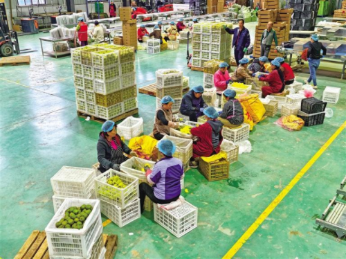 10月10日,在全国最大规模猕猴桃开采仪式现场,工人将新鲜采摘的猕猴桃装箱。记者 田若楠摄