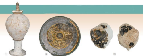 图①②③分别为张九龄夫人董韶容墓出土的陶塔式罐、金银平脱镜、胭脂盒(资料照片)。 陕西省考古研究院供图