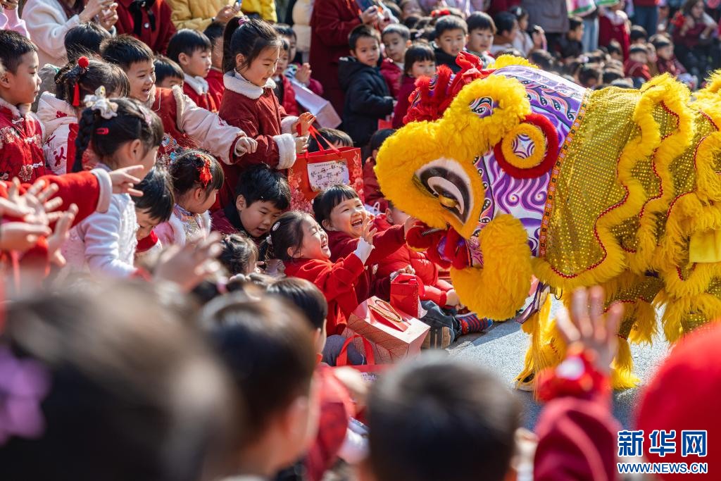 12月30日,在浙江省温岭市级机关幼儿园,孩子们与舞狮互动。