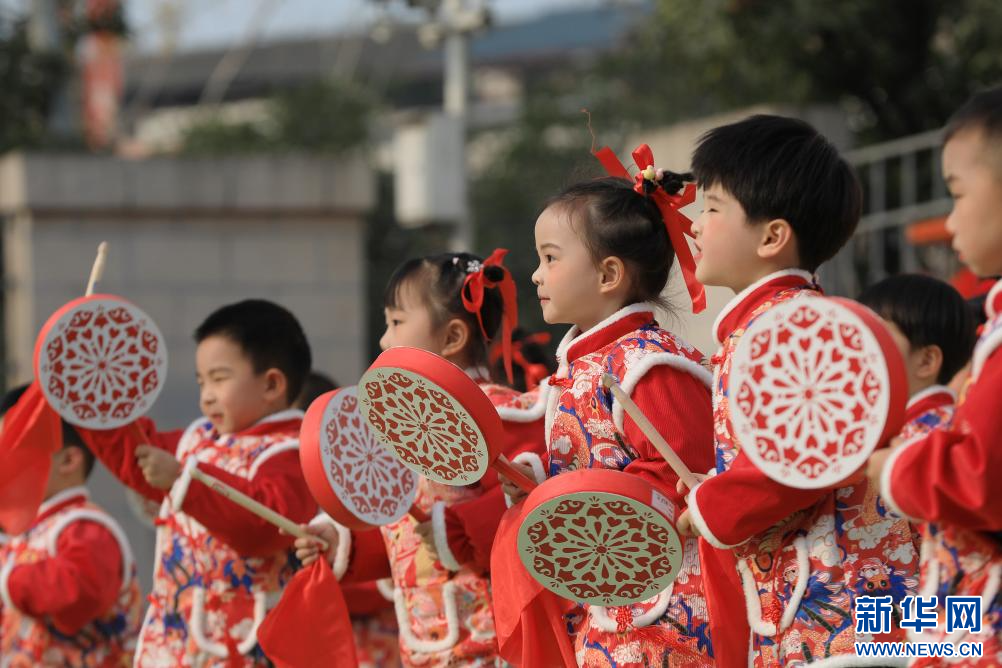 12月26日,在浙江省湖州市德清县中心幼儿园,孩子们参加传统民俗活动。