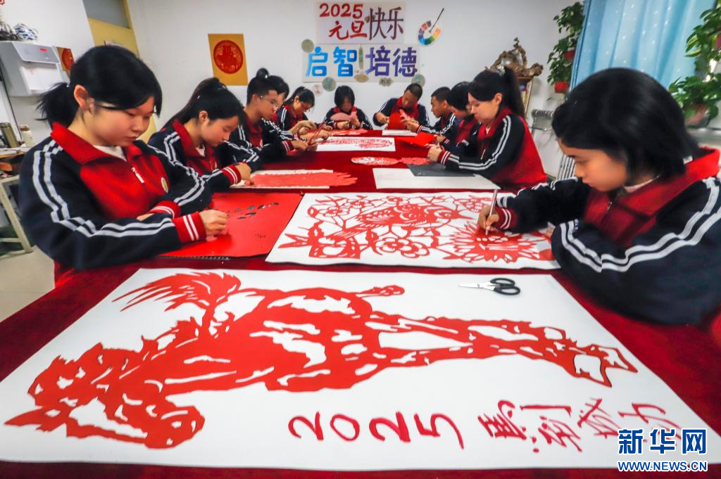 12月26日,河北省遵化市第一中学的学生在参加迎新年剪纸创作活动。