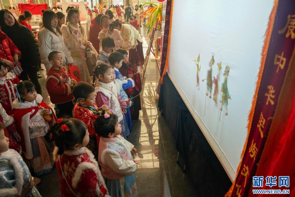 12月30日,四川省眉山市彭山区学院路幼儿园小朋友在区文化馆新春非遗市集活动上观看非遗皮影戏。