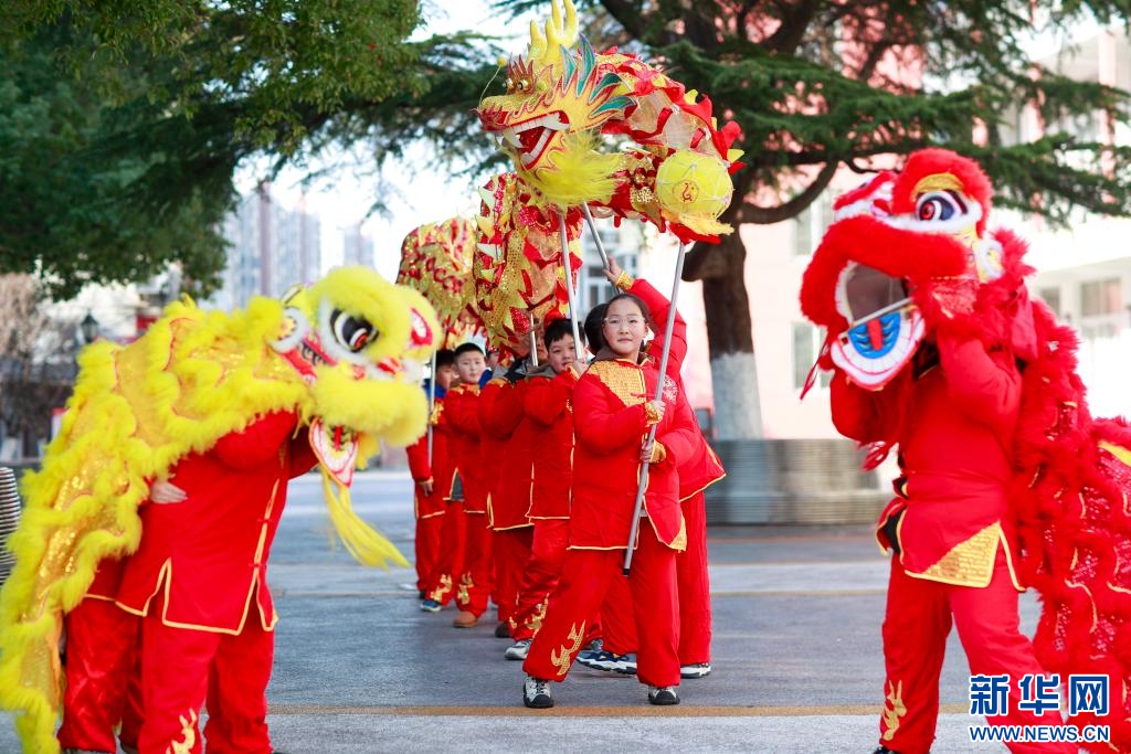 12月26日,在江苏省兴化市新生中心小学,孩子们在老师的指导下体验舞龙舞狮。