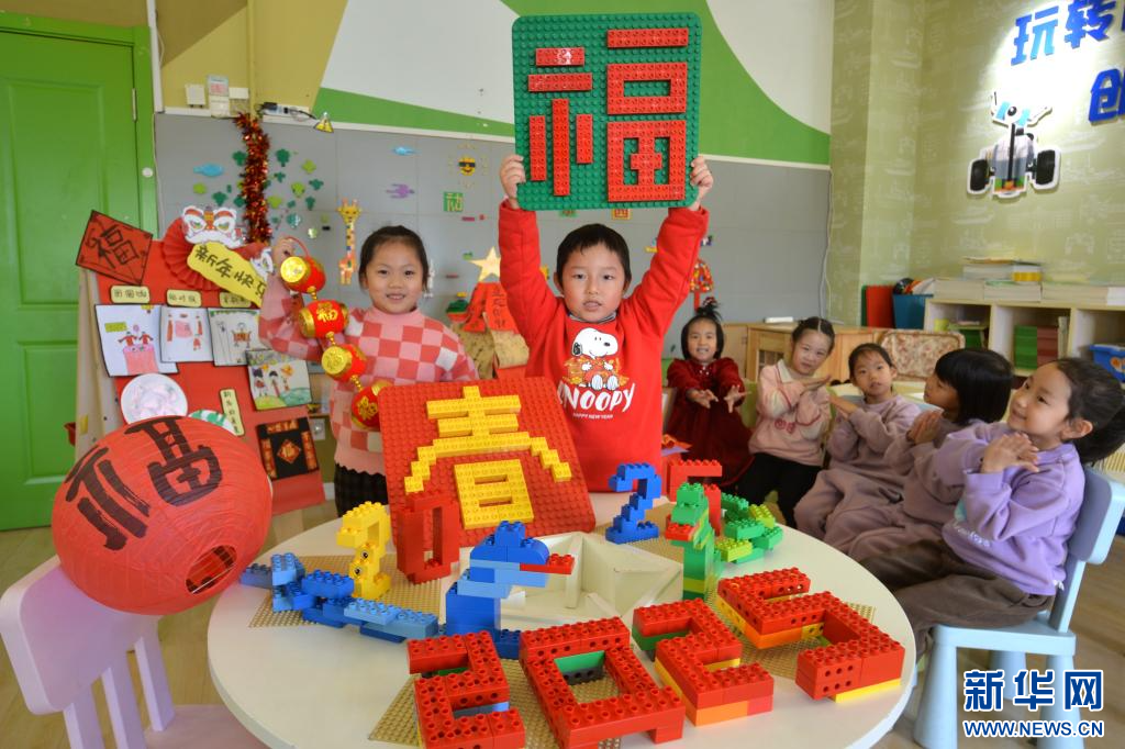 12月26日,在山东省青岛市市北区海安幼儿园,小朋友们用乐高积木拼出2025新年祝福。