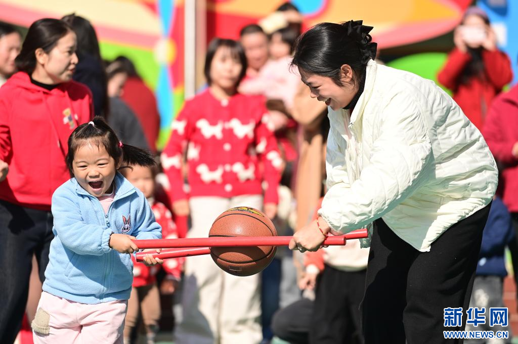 12月30日,在江西省赣州市章贡区第十五保育院,小朋友和家长在玩“合力运福球”趣味游戏。