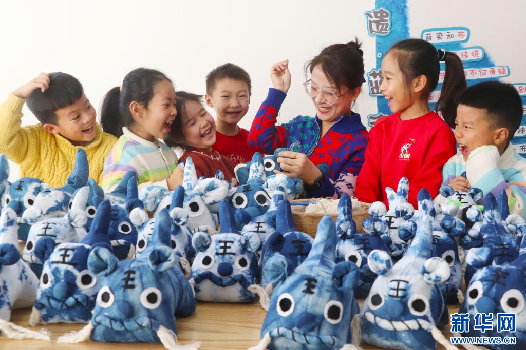 12月26日,在山东省高密市凤鸣实验幼儿园举行的“学非遗 迎新年”活动中,老师利用自制的蓝染布料缝制新年礼物。