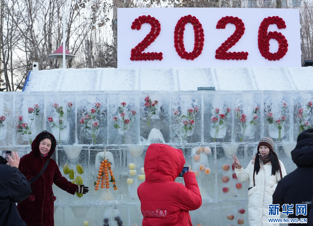 2026年1月1日,在沈阳浑河外滩市集,市民在玫瑰相框景观造型处拍照留影。