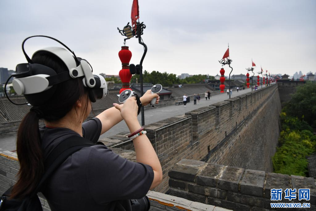 游客在西安城墙一处马面上体验一款以射箭守城为主题的MR混合现实游戏(2025年9月10日摄)。