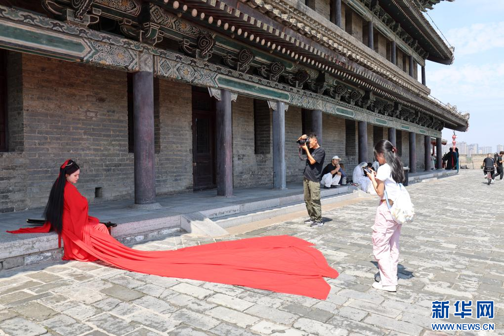 游客在西安城墙上拍摄艺术照(2025年9月12日摄)。